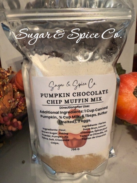Ingredients: Flour, Brown Sugar, Baking Powder, Pumpkin mPie Spice, Salt, Chocolate Chips.