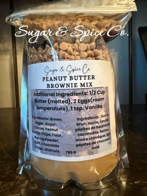 Ingredients: Brown Sugar, Sugar, Cocoa, Peanut Butter Chips, Flour, Baking Powder, Salt, Chocolate Chips, Walnuts.
