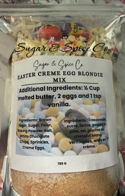 Ingredients: Brown Sugar, Sugar, Flour, Baking Powder, Salt, White Chocolate Chips, Sprinkles, Creme Eggs.